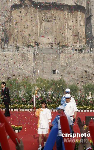 9月4日,火炬手在最具洛陽特色的城市名片--世界文化遺產(chǎn)龍門石窟景區(qū)內(nèi)傳遞殘奧會(huì)火炬。當(dāng)日,北京2008殘奧會(huì)火炬在千年帝都、牡丹花城洛陽傳遞,有65名火炬手參加傳遞。北京2008殘奧會(huì)火炬?zhèn)鬟f共有兩條線路,一是“時(shí)代風(fēng)采線”,二是“中華文明線”,洛陽是“中華文明線”5個(gè)殘奧會(huì)火炬?zhèn)鬟f城市之一,也是進(jìn)入北京前的最后一個(gè)傳遞城市。9月5日兩路火炬將在北京匯合,9月6日晚在殘奧會(huì)開幕式主會(huì)場點(diǎn)燃主火炬。中新社發(fā) 張曉理 攝