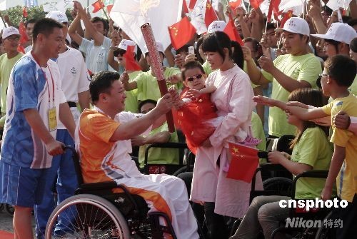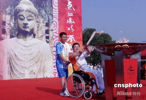 9月4日, 火炬手在最具洛陽(yáng)特色的城市名片——世界文化遺產(chǎn)龍門(mén)石窟景區(qū)內(nèi)傳遞殘奧會(huì)火炬。當(dāng)日,北京2008殘奧會(huì)火炬在千年帝都、牡丹花城洛陽(yáng)傳遞,這是火炬進(jìn)京前最后一站,共有65名火炬手參加。中新社發(fā) 張曉理 攝