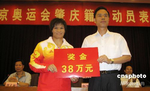 九月四日下午,廣東肇慶隆重舉行表彰大會(huì),百萬(wàn)重金重獎(jiǎng)該市參加第二十九屆北京奧運(yùn)會(huì)的肇慶藉運(yùn)動(dòng)員,其中,“媽媽冠軍”冼東妹共獲三十九萬(wàn)五千元人民幣的獎(jiǎng)勵(lì)。在北京奧運(yùn)上,肇慶藉共輸送了女子柔道、賽艇、皮艇等項(xiàng)目運(yùn)動(dòng)員四人。其中,女子柔道五十二公斤級(jí)運(yùn)動(dòng)員衛(wèi)冕冠軍,成為名揚(yáng)天下的“媽媽冠軍”。