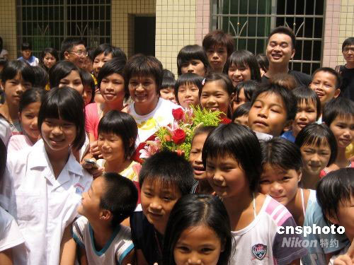 九月五日上午,“媽媽冠軍”冼東妹回到母校廣東四會市業(yè)余體校,鼓勵在校的師弟師妹要練好基本功,努力成才,從小樹立為國爭光為家鄉(xiāng)爭光的理想。一九七五年九月十五日,冼東妹出生在廣東四會逕口鎮(zhèn)新農(nóng)村的一個普通農(nóng)家。一九八八年,東妹進(jìn)四會市業(yè)余體校先練習(xí)摔跤。中新社發(fā) 黃耀輝 攝