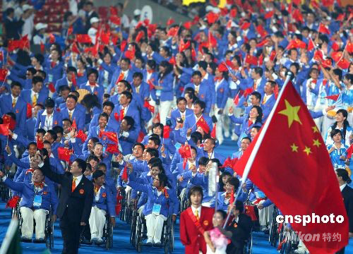 9月6日晚,北京2008殘奧會開幕式在北京國家體育場——“鳥巢”舉行,圖為由547人組成的龐大東道主代表團--中國殘奧代表團入場,旗手是刷新3項世界紀錄的20歲的中國殘疾人游泳運動員王曉福。 中新社發(fā) 宋吉河 攝