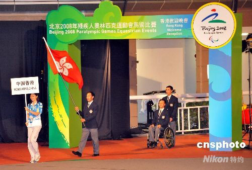 九月六日,北京二零零八年殘奧會(huì)馬術(shù)比賽開幕式在香港舉行歡迎晚會(huì),香港殘奧馬術(shù)選手葉少康在運(yùn)動(dòng)員入場(chǎng)式上進(jìn)場(chǎng)。中新社發(fā) 鄧慶樂 攝