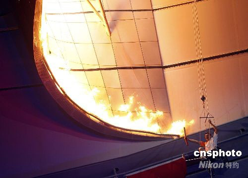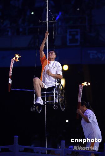 9月6日晚,北京2008殘奧會(huì)開幕式在國家體育場(chǎng)“鳥巢”舉行。 圖為殘奧會(huì)田徑金牌獲得者、最后一棒火炬手侯斌坐在輪椅上,拉繩子攀升至主火炬臺(tái)下,以獨(dú)特方式點(diǎn)燃“鳥巢”上方的主火炬。 中新社發(fā) 杜洋 攝