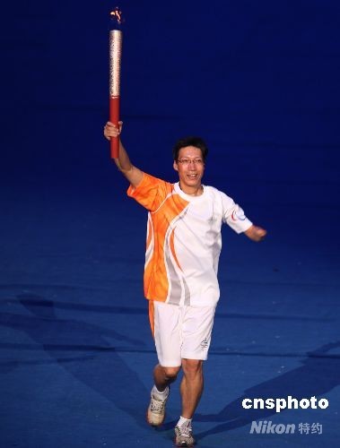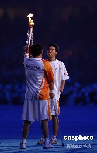 9月6日晚,北京2008殘奧會(huì)開(kāi)幕式在國(guó)家體育場(chǎng)“鳥(niǎo)巢”舉行。運(yùn)動(dòng)員進(jìn)行火炬?zhèn)鬟f。
