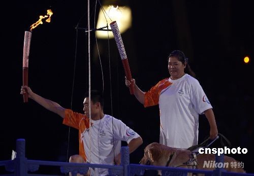 圖為平亞麗在導(dǎo)盲犬的幫助下點(diǎn)燃主火炬點(diǎn)燃者侯斌手上的火炬。最后一棒火炬手侯斌(左)是三屆殘奧會(huì)的冠軍得主。中新社發(fā) 杜洋 攝