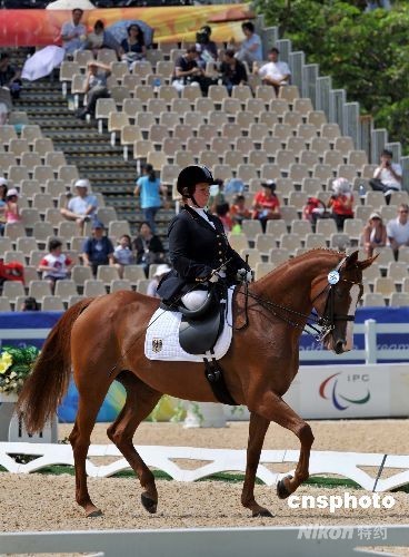 圖為德國(guó)選手安格莉卡·特拉貝特在盛裝舞步團(tuán)體賽--級(jí)別II,發(fā)揮出色,以個(gè)人最佳成績(jī)名列榜首。