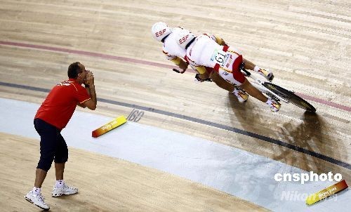 9月7日,北京殘奧會場地自行車項目的角逐在北京老山自行車館正式拉開帷幕。在男子個人追逐賽(B&VI)資格賽中,西班牙隊教練在場邊指導西班牙選手克里斯蒂安·本赫和領騎員戴維·廖拉多。中新社發(fā) 盛佳鵬 攝
