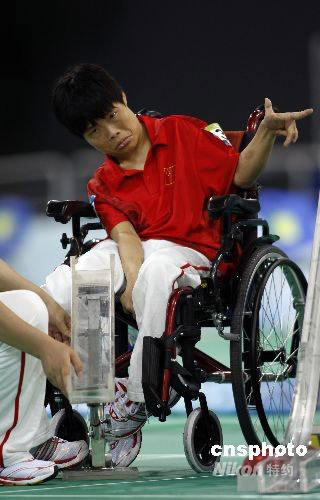 9月7日,北京殘奧會(huì)硬地滾球比賽,中國(guó)選手朱賀僑在混合單打BC3級(jí)別小組賽中以1比11不敵希臘選手格里戈里奧斯。中新社發(fā) 杜洋 攝