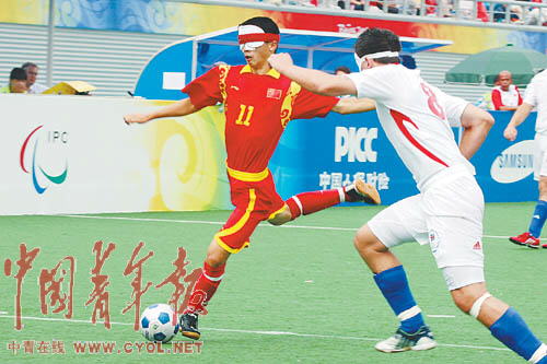 在這短短兩年時間里,中國盲人足球隊從無到有。那些根本無法看到腳下皮球的隊員們,對足球和生活的熱愛是他們每天兩三個小時重復(fù)那套固定帶球技術(shù)的最大動力。和人們印象中丑陋的中國足球截然相反,無論是前鋒還是后衛(wèi),他們帶球行進如行云流水,只要球在腳下,就有足夠的技術(shù)和智慧去完成對皮球的控制——本場比賽獨中兩元的王亞峰更是明星中的明星,他在前場毫不停頓的突破讓英國隊的盯人和區(qū)域兩套防守陣容形同虛設(shè)。