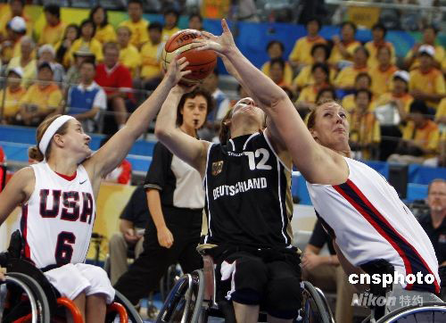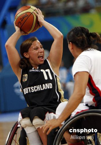 9月8日,北京殘奧會(huì)女子輪椅籃球A組預(yù)賽中,德國隊(duì)(深色)以38比42的比分?jǐn)≡诿绹?duì)手下。 中新社發(fā) 杜洋 攝