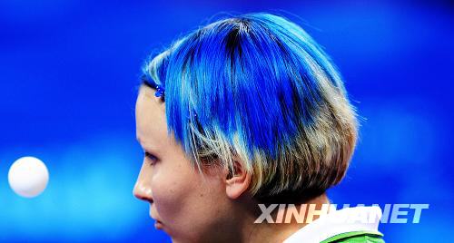 9月8日,斯洛文尼亞選手馬泰婭·平塔爾在比賽中。當(dāng)日,馬泰婭·平塔爾在北京2008年殘奧會(huì)乒乓球女子單打F3A組比賽中以3比2戰(zhàn)勝法國(guó)選手范妮·貝特朗。賽場(chǎng)上,多彩的發(fā)型使她更加青春靚麗。新華社記者 徐家軍 攝