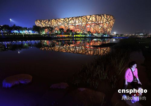9月8日,在國(guó)家體育場(chǎng)“鳥巢”外,觀眾紛紛在美麗的夜景前留影。中新社發(fā) 廖攀 攝