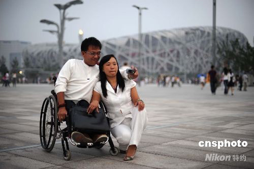 圖:殘疾青年和伴侶“鳥巢”外溫情留影