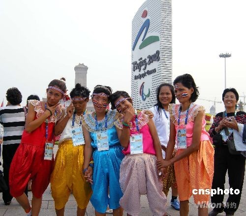 2008年9月8日,為北京殘奧會(huì)助威的泰國(guó)“啦啦隊(duì)”成員來到天安門廣場(chǎng)游覽,并高興地拍照留影。中新社發(fā) 玉龍 攝