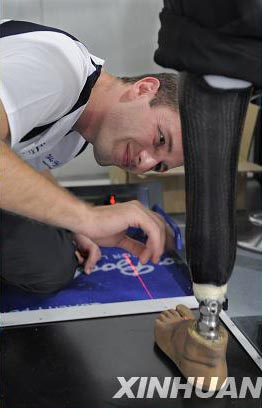 圖為9月8日,維修人員通過激光校準(zhǔn)儀在為一名俄羅斯運(yùn)動(dòng)員的“左腳”進(jìn)行檢測。新華社記者 陳曉偉攝