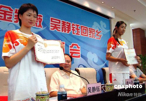 9月8日,江西省景德鎮(zhèn)市熱烈歡迎北京奧運(yùn)會冠軍金紫薇、吳靜鈺載譽(yù)回鄉(xiāng),景德鎮(zhèn)市婦聯(lián)和團(tuán)委分別授予兩人“三八紅旗手標(biāo)兵”稱號和“五四青年獎(jiǎng)?wù)隆薄T诖舜伪本⿰W運(yùn)會上,金紫薇和吳靜鈺分別奪得賽艇女子4人雙槳項(xiàng)目和跆拳道女子49公斤級比賽冠軍。 中新社發(fā) 程萬海 攝