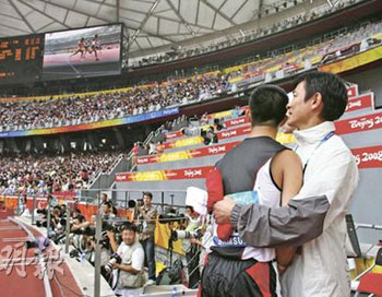 起步較遲的蘇樺偉原本一度落后其它選手數(shù)個身位,但憑著凌厲后勁,最終以12秒38沖線?邕^終點的他眼泛淚光,打算離場之際,發(fā)現(xiàn)無論在生活及比賽中都一直支持他的藝人劉德華,早已在終點守候,兩人隨即握手相擁。逾萬觀眾看到這一幕,歡呼喝彩聲響徹云霄。