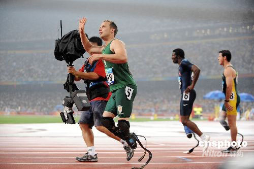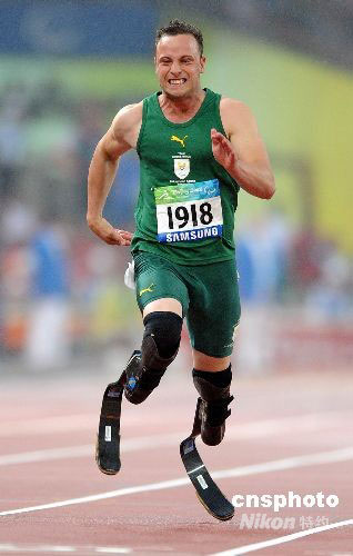 9月9日,在國(guó)家體育場(chǎng)進(jìn)行的北京2008年殘奧會(huì)男子100米T44級(jí)決賽中,有“刀鋒戰(zhàn)士”之稱的南非著名殘疾人運(yùn)動(dòng)員皮斯托瑞斯以11秒17的成績(jī)奪得冠軍。中新社發(fā) CNAsports 攝