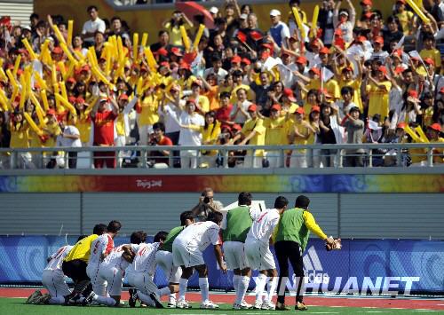 終場哨音響起,他們集體跑向北側(cè)邊線,彼此手搭肩頭站成橫排,然后雙膝跪地,向看臺上為他們加油的中國觀眾表達(dá)感激之情。意外的舉動,令現(xiàn)場觀眾先是一愣,隨即報(bào)以更熱烈的掌聲與吶喊。