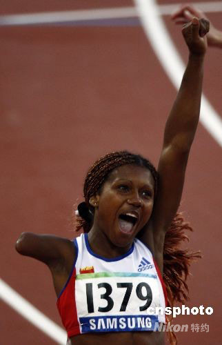 9月10日,北京殘奧會(huì)田徑比賽女子100米-T46決賽中,古巴選手卡斯蒂略以12秒04的成績(jī)打破世界紀(jì)錄獲得冠軍。圖為奪冠后卡斯蒂略振臂歡慶。中新社發(fā) 杜洋 攝