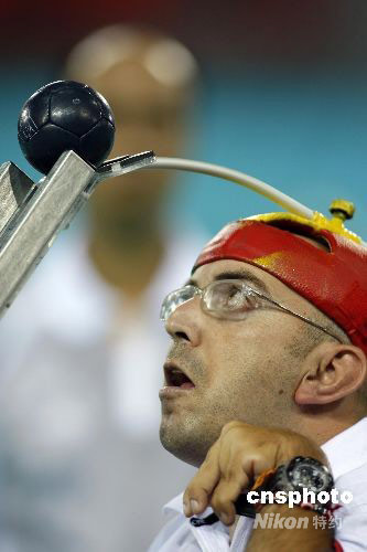 9月7日,北京殘奧會硬地滾球比賽,葡萄牙選手阿爾曼多-科斯塔在混合單打BC3級別小組賽中以8比0戰(zhàn)勝西班牙選手。圖為葡萄牙選手阿爾曼多-科斯塔在比賽中聚“睛”會球。中新社發(fā) 杜洋 攝
