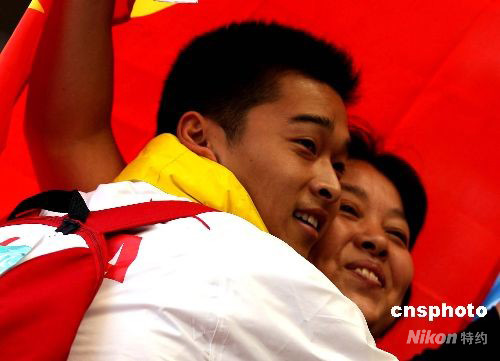 圖:郭偉殘奧會鐵餅奪冠后喜擁慈母