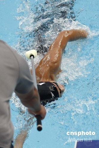 9月11日,北京2008年殘奧會(huì)游泳S11級(jí)男子400米自由泳預(yù)賽,在北京國(guó)家游泳中心“水立方”進(jìn)行,教練在泳池邊為選手“指路”。視力障礙的運(yùn)動(dòng)員根據(jù)他們視力的喪失程度被分成三個(gè)級(jí)別B1、B2和B3級(jí)。在殘疾人游泳比賽中運(yùn)動(dòng)員分別參加11級(jí)、12級(jí)、13級(jí)比賽,分別對(duì)應(yīng)B1、B2和B3級(jí)。有視覺障礙的運(yùn)動(dòng)員按要求可在個(gè)人比賽和接力比賽中有一名工作人員對(duì)其進(jìn)行引導(dǎo)。全盲運(yùn)動(dòng)員比賽過程中接近池壁時(shí),引導(dǎo)員利用提示棒敲擊運(yùn)動(dòng)員背部進(jìn)行提示。中新社發(fā) 盛佳鵬 攝