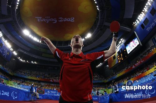 9月11日,北京殘奧會乒乓球男子M6決賽中,丹麥選手皮特·羅森邁耶以3比1戰(zhàn)勝了德國選手丹尼爾獲得冠軍。中新社發(fā) 杜洋 攝