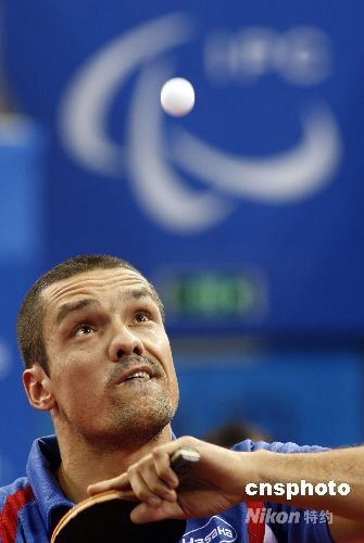 9月11日,北京殘奧會乒乓球男子M4-5決賽中,法國選手迪郎以3比2的比分戰(zhàn)勝韓國選手鄭恩昌獲得冠軍。 中新社發(fā) 杜洋 攝