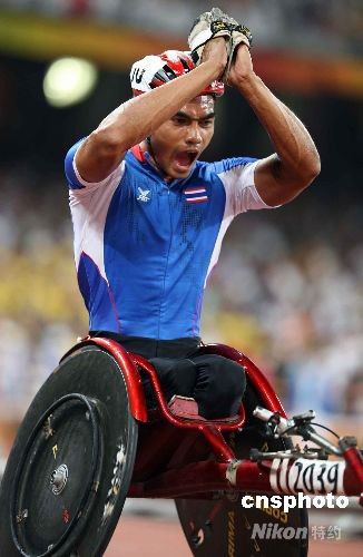 9月11日晚,北京殘奧會田徑比賽繼續(xù)在奧林匹克公園內(nèi)的國家體育場“鳥巢”舉行,在男子5000米-T54級決賽中,泰國選手巴越·沃霍倫一路領(lǐng)先,并在最后時刻頂住各路選手的反撲,在這個一直被歐美強(qiáng)手統(tǒng)治的項(xiàng)目中奪得冠軍。中新社發(fā) 任晨鳴 攝