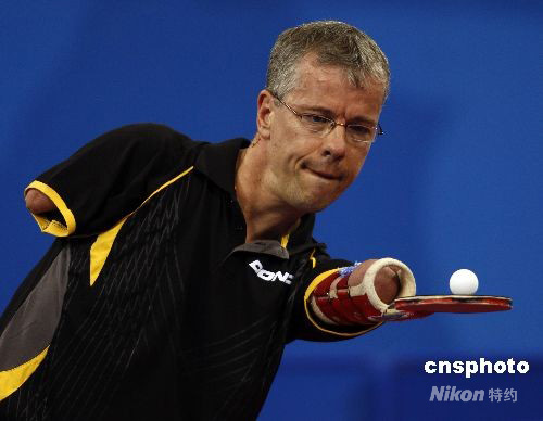 9月11日,北京殘奧會(huì)乒乓球男子M6比賽中,德國(guó)無(wú)手選手萊納-施密特獲得第四名。 中新社發(fā) 杜洋 攝