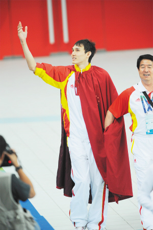 雖然最終收獲的還是“銀鑲玉”,但是楊博尊的心情已和8日晚有著天壤之別,臉上掛滿了笑容!斑@雖然不是我的主項,但是我發(fā)揮得很好,超越了自己。現(xiàn)在我終于知道,‘水立方’不僅有‘金鑲玉’,還有更多的是超越。無論是我,還是我的隊友,我們都很努力,都在不斷地超越自己!迸d奮的楊博尊披上了早就準(zhǔn)備好的“戰(zhàn)袍”,這本是他為自己奪冠時準(zhǔn)備的。