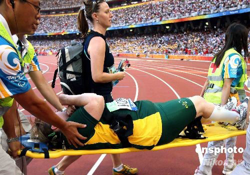 9月12日,北京殘奧會田徑比賽舉行在北京奧林匹克公園內(nèi)的國家體育場-鳥巢舉行,澳大利亞女子鉛球選手卡思·普勞德福特在上午進行的女子鉛球-F35/36級別的比賽第五次投擲后當場昏厥,被緊急送往醫(yī)院救治。 中新社發(fā) 任晨鳴 攝