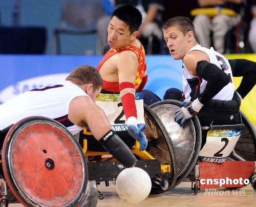 9月12日,殘奧會(huì)輪椅橄欖球比賽在北京科技大學(xué)體育館開賽,揭幕戰(zhàn)中國(guó)隊(duì)以30-65不敵世界排名第一的美國(guó)隊(duì)。剛剛組建一年的中國(guó)隊(duì)雖然戰(zhàn)敗,但始終面對(duì)微笑頑強(qiáng)拼搏永不言棄的球員們卻贏得了滿堂喝彩,贏得了包括美國(guó)隊(duì)在內(nèi)的各方交口稱贊。中新社發(fā) CNAsports_p 攝