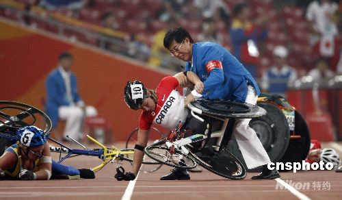 9月8日晚,北京殘奧會(huì)田徑比賽女子5000米T54級(jí)決賽在北京國(guó)家體育場(chǎng)“鳥(niǎo)巢”進(jìn)行,選手們?cè)诒荣愔邢嘧驳沟。裁判扶起倒地的加拿大選手特蕾西·弗爾格。