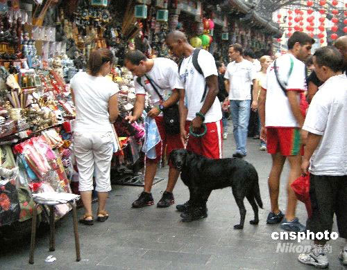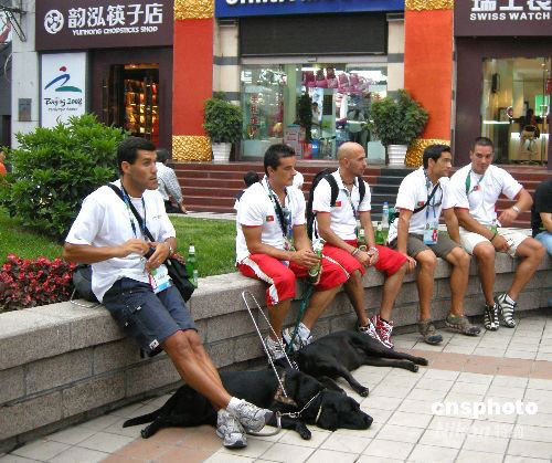 2008年9月16日下午,幾名參加北京殘奧會的外國運動員來到王府井游覽購物,忠實的導(dǎo)盲犬一直尾隨在其中的盲人運動員左右。中新社發(fā) 玉龍 攝