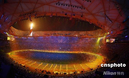 9月17日晚,北京2008年殘奧會(huì)閉幕式在國(guó)家體育場(chǎng)“鳥巢”盛大舉行。閉幕式上灑遍“鳥巢”的香山紅葉和殘奧圣火交相輝映。 中新社發(fā) 盛佳鵬 攝