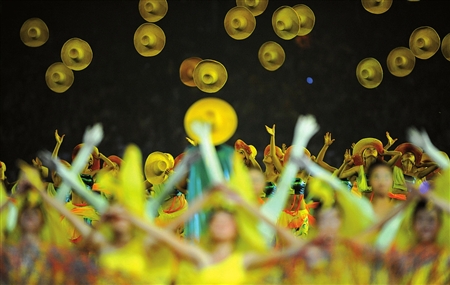 “歡慶篇章”是整臺晚會“寄給未來的一封信”的壓軸戲,而“草帽舞”是“歡慶”中的高潮部分、晚會的亮點之一。昨晚草帽舞華麗登場時,成都的姑娘們從舞臺的左臺口向舞臺的右底角走“斜線一字”,動作整齊,節(jié)奏分明,邊行進(jìn)邊傳遞草帽,她們的隊列沉穩(wěn)舒緩,時圓時方,變化萬千。到達(dá)鳥巢中間時,草帽突然像金色的花朵,從演員手中快速飛出,在空中彼此飛舞,宛如向日葵花簇簇綻放,蔚為壯觀。而在草帽舞隊的四周,還有兩千多人輔以奔放灑脫的舞蹈表演。此時鳥巢內(nèi)已是掌聲雷動,歡呼陣陣。整個節(jié)目傳遞的是青春、是快樂,是少女的激情與奔放,是自由與陽光,是未來的希望,表演服飾也以紅黃為主調(diào),大紅艷麗,大黃成熟,直奔?xì)g慶主題。成都的姑娘們退場后激動地說,她們的自信和當(dāng)晚的演出成功,離不開奧組委領(lǐng)導(dǎo)的關(guān)心支持。據(jù)悉,這批專業(yè)演員全部由成都市文化藝術(shù)學(xué)校的專業(yè)舞蹈學(xué)生、演員和舞蹈教師組成。(周帥)