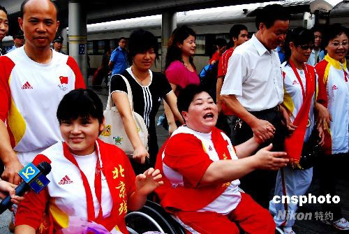 9月21日早上8點(diǎn)30分左右,從北京駛向南昌的Z67次列車?磕喜九_(tái),江西省參加北京殘奧會(huì)的3名運(yùn)動(dòng)員凱旋而歸。許多市民手捧鮮花、手舉紅旗來到現(xiàn)場(chǎng)夾道迎接運(yùn)動(dòng)員。中新社發(fā) 胡國林 攝