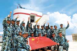 一面國旗,升華了守礁官兵的全部情感。平時(shí),我們說到國家主權(quán)總是很抽象、很模糊,然而在南沙,主權(quán)、領(lǐng)土、國家利益這些概念,卻是那樣的具體和清晰!敖癯I(yè)南沙,千秋有功國家”,這是南沙官兵最喜歡的口號(hào)。因?yàn)樗麄冎,守住南沙,就是守住中華民族的千秋基業(yè),就是守住子孫后代的發(fā)展空間!