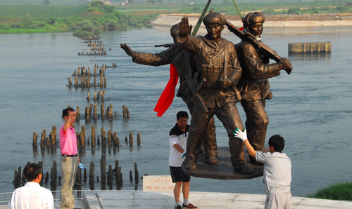 為紀(jì)念抗美援朝戰(zhàn)爭(zhēng)60周年,由丹東市委宣傳部組織實(shí)施的兩組主題分別為《送別親人》和《告別祖國(guó)》的雕塑昨日(5日)下午運(yùn)抵抗美援朝戰(zhàn)爭(zhēng)遺址——鴨綠江燕窩鐵路橋和鴨綠江沙河口鐵路橋。