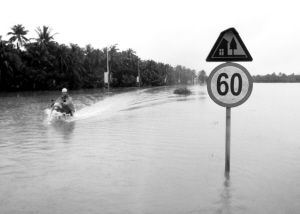 瓊海嘉積鎮(zhèn)多條道路遭受內(nèi)澇。17日下午2時許,南國都市報記者徒步趟過3公里積水路段,來到上次受災(zāi)嚴重的嘉積鎮(zhèn)橋頭村委會。該村委會通往嘉積的兩條道路豪華路、嘉博路部分路段積水超過1米。如果不是路邊豎立的路燈,很難分清哪里是道路,哪里是路邊水田。
