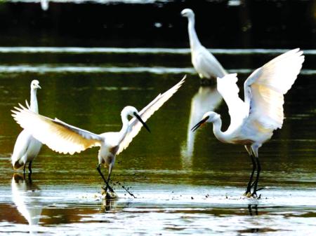 白鷺們只只都是捕魚高手,細(xì)長的雙腳往魚塘里一插,一低頭,魚兒就到嘴了。盡管吞食的速度還挺快,但也許因?yàn)樗鼈凅w態(tài)優(yōu)美,渾身潔白,倒不覺得狼吞虎咽。不少吃飽的白鷺,撲撲翅膀翩翩起舞,運(yùn)動運(yùn)動有助消化。有的估計吃太飽了,站在水里一動不動,偶爾梳理一下自己的羽毛。酒足飯飽,臭美一下也是應(yīng)該的。