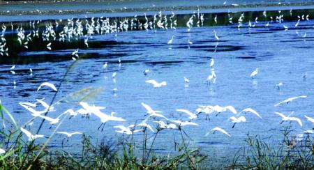 白鷺們聚集的寶地是一塊十余畝的魚塘。從25日開始,魚塘捕魚后放水“曬塘”,淺淺地露出了塘底。眼尖的白鷺們一眼就瞅見了漏網(wǎng)的小魚,紛紛呼朋引伴,來飽餐一頓。大的、小的,公的、母的都趕來了,一會兒,千余只白鷺齊聚。