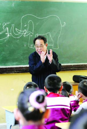 傳統(tǒng)牙雕的傳人馮蕉生不愧是藝術(shù)家,他幾筆就在黑板上勾勒出一頭大象,然后問(wèn)同學(xué)們,什么材料可以用來(lái)雕刻,“木頭”、“石頭”、“蘿卜”,同學(xué)們說(shuō)了好幾種,終于說(shuō)到了象牙。