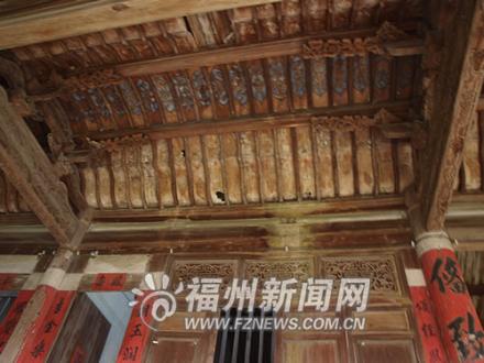 戴祥滋故居為四合院式民居,建于民國初期,系穿斗式木構(gòu)架,面闊五間,大門前有大埕,正座建有前軒廊,后院有天井和單坡頂?shù)幕乩,正厝右?cè)有附厝,左側(cè)50米處設(shè)有門樓和石構(gòu)三層碉樓各一座。記者發(fā)現(xiàn),該宅規(guī)模較大,建造裝修十分講究,屏門上方及軒廊、梁架等處均雕刻有精美的圖案,色彩明麗。