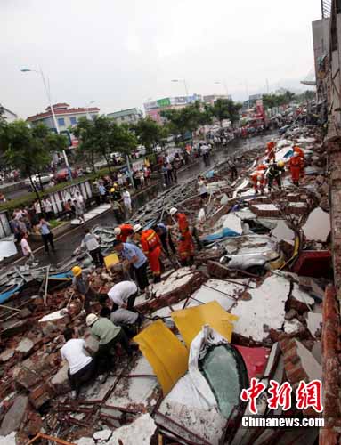 今天下午4點(diǎn)45分,記者趕到現(xiàn)場。發(fā)生事故是巨桑國際家居博覽中心一幢兩層高的樓房,樓房頂部還架有大型廣告牌,此時(shí)該樓房已有約50米長的外墻倒塌,現(xiàn)場已經(jīng)設(shè)置起警戒,公安、消防、醫(yī)院等部門的救援人員及巨桑工作人員等近百人正在倒塌現(xiàn)場全力展開搜救工作,衢州市及柯城區(qū)有關(guān)領(lǐng)導(dǎo)也已趕到現(xiàn)場。