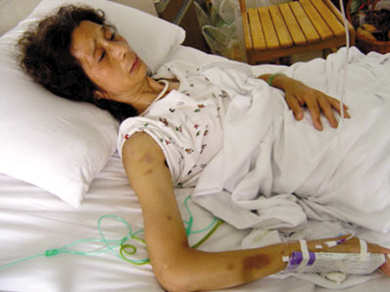 據(jù)該帖描述,陳玉蓮頭上、身上、胳膊上、腿上遍布傷痕。診斷結(jié)果是,她被打成腦震蕩,軟組織挫傷幾十處,左腳功能障礙,植物神經(jīng)紊亂……她躺在病床上,渾身哆嗦,嘔吐腹瀉不止,發(fā)燒幾天,身心受到了重創(chuàng)。陳玉蓮的妹妹陳翠蓮昨晚接受羊城晚報(bào)記者采訪時(shí)說,陳玉蓮剛打過針,因腦震蕩影響,正在病床上昏睡,而她左腳至今無法踏地。
