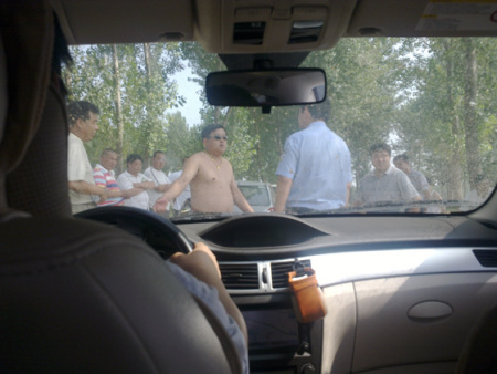 面對(duì)民警,在摩托車被推開后,不明身份人員仍不愿放行,“金鏈子”裸著上身更是蹲在車前不肯起來,稱“除非賠我們莊稼錢”……經(jīng)民警多次勸說,記者終于在當(dāng)日下午4時(shí)許安全抵達(dá)了狼城崗鎮(zhèn)政府。