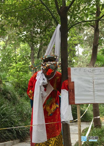 身穿大紅袍,頭戴金冠,脖子套在白布綾挽成的結(jié)上。7月23日下午16時(shí)許,鄭州市紫荊山公園內(nèi)一棵大樹(shù)下,一男子扮成一“財(cái)神爺”模樣欲“上吊”尋短見(jiàn)討回農(nóng)民工血汗錢。